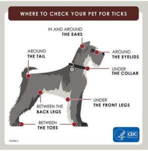 You can help prevent the spread of disease by examining your pet after visiting areas know for ticks. If a tick is found, it should be removed promptly with a pair of tweezers as close to the skin as possible. Wear gloves or wash hands well afterward. You can save the tick and bring it to us for possible identification.